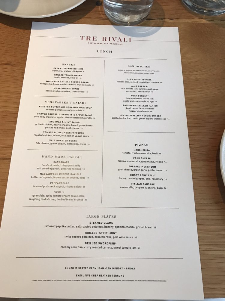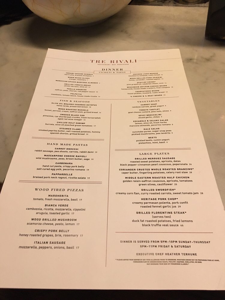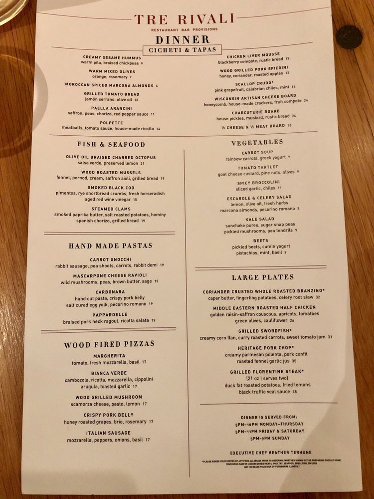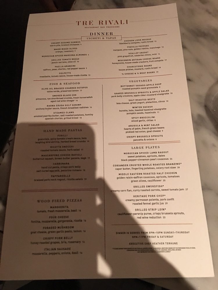 Tre Rivali presents a fusion of Mediterranean and New American cuisine, offering a variety of sharable bites, dips, spreads, hand-made pastas, and more. Located in Milwaukee, WI, this trendy spot features outdoor seating, a full bar, and happy hour specials. With options for vegetarians, gluten-free diners, and even dog-friendly outdoor seating, Tre Rivali caters to diverse preferences. Customers praise the ambiance, attentive service, and flavorful dishes highlighting lamb kawarma, squid ink spaghetti, and pappardelle bolognese. While some diners note issues with saltiness in certain dishes, the overall dining experience at Tre Rivali is described as upscale and satisfying. For a memorable dining experience with a touch of Mediterranean flair, Tre Rivali is a worthy choice in the vibrant Third Ward neighborhood.